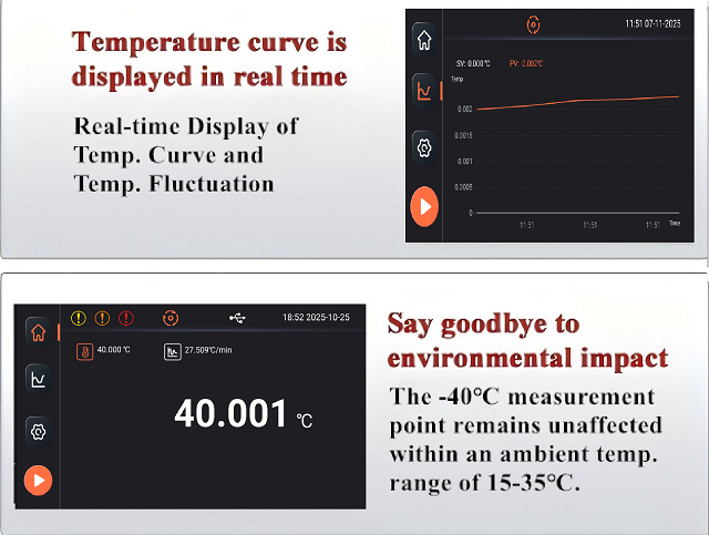 4.Smart touchscreen interface: Smart touchscreen control with 0.001°C resolution. Real-time display of temperature curve and fluctuation.